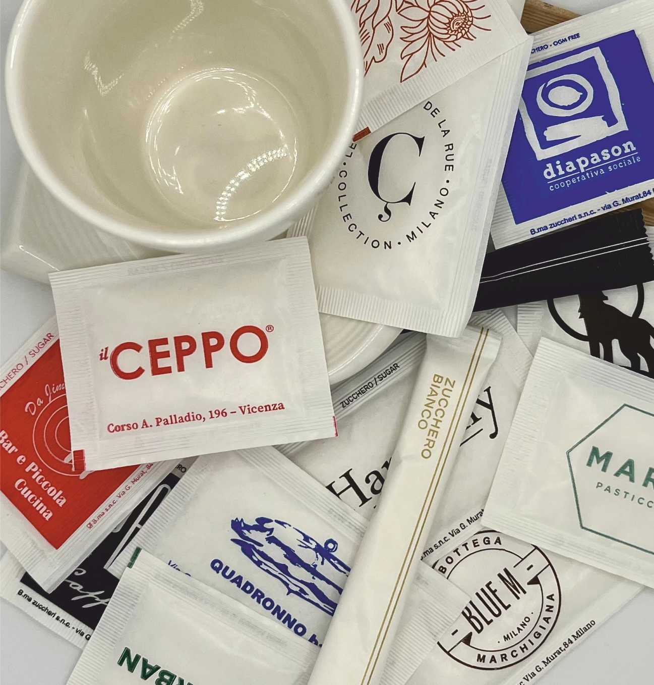 Le nostre bustine personalizzate di zucchero e dolcificanti offrono un tocco di eleganza e professionalità.